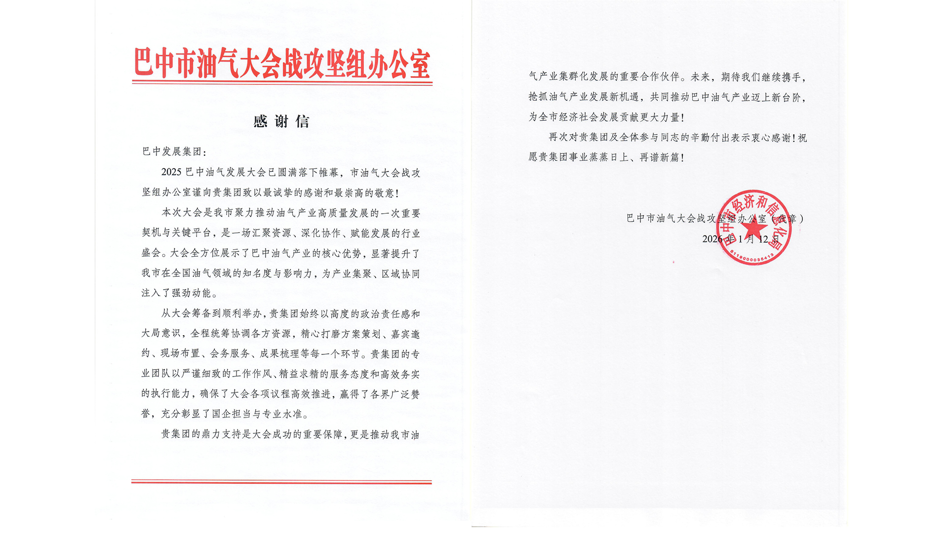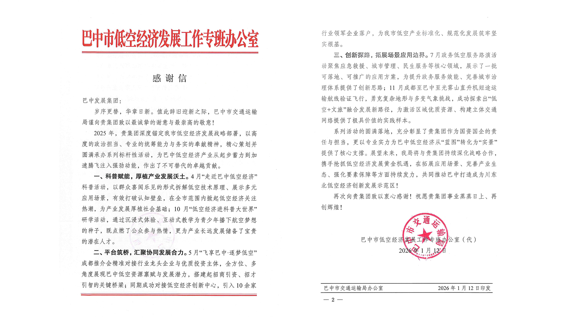 近日,巴中發(fā)展控股集團(tuán)有限公司收到來自巴中市低空經(jīng)濟(jì)發(fā)展工作專班辦公室和巴中市油氣大會(huì)戰(zhàn)攻堅(jiān)組辦公室的感謝信。信中對(duì)2025年巴中發(fā)展集團(tuán)積極支持低空經(jīng)濟(jì)產(chǎn)業(yè)和推動(dòng)油氣產(chǎn)業(yè)高質(zhì)量發(fā)展表示感謝。