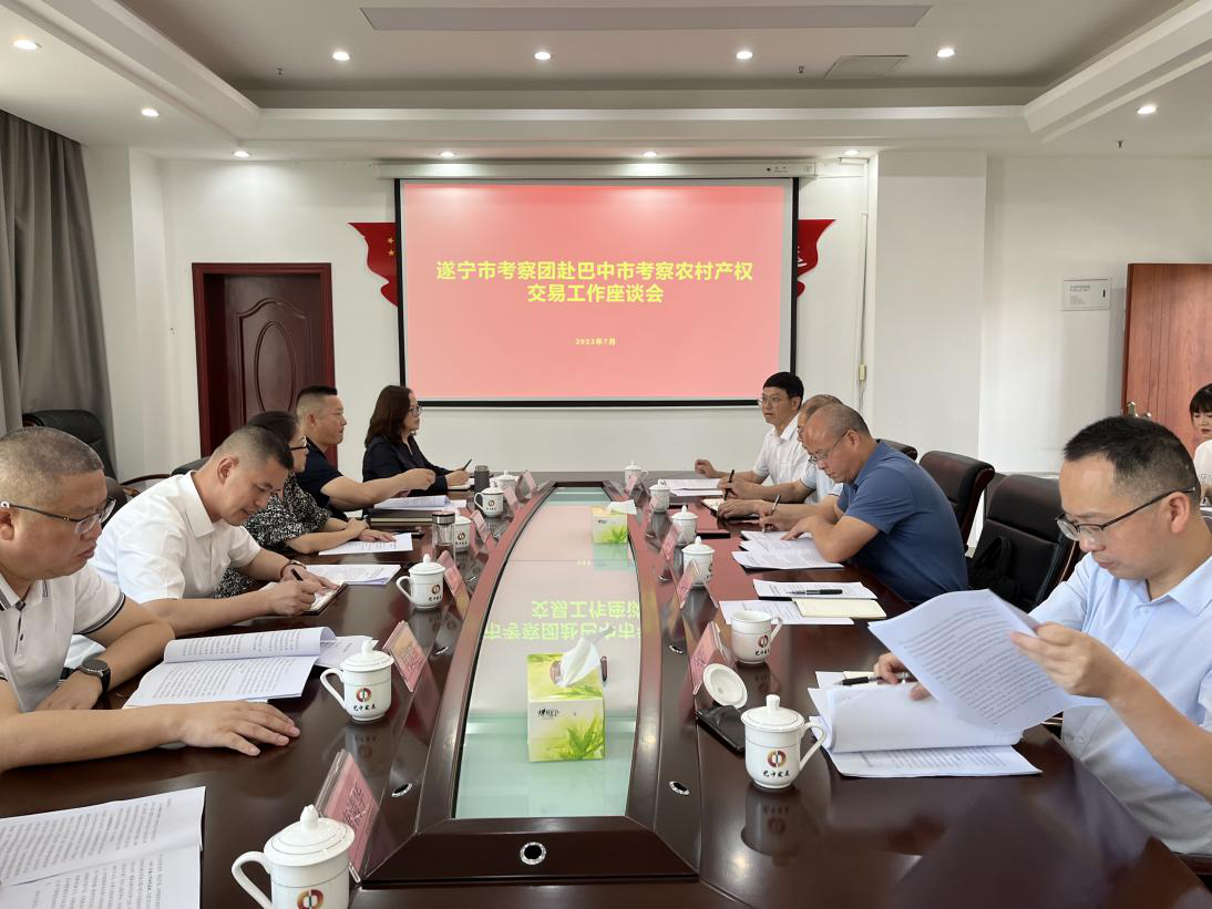 7月4日,由遂寧市政府副秘書長劉旭帶隊(duì),遂寧市農(nóng)業(yè)農(nóng)村局副局長劉罡霏、遂寧市財(cái)政局副局長何國強(qiáng)、遂寧興業(yè)集團(tuán)黨委書記、董事長向誠、遂寧數(shù)字產(chǎn)業(yè)集團(tuán)黨委書記、董事長唐清華、遂寧市金融工作局資本市場科科長黎陳等一行人員蒞臨巴中發(fā)展控股集團(tuán)有限公司考察農(nóng)村產(chǎn)權(quán)交易工作并召開座談會(huì),巴中市政府副秘書長何潔明主持會(huì)議,巴中市農(nóng)業(yè)農(nóng)村局副局長馮金光、農(nóng)村改革科科長楊忠平、巴中發(fā)展控股集團(tuán)黨委委員、副總經(jīng)理劉仕勇、成都農(nóng)交所巴中分公司總經(jīng)理、巴中市鑫匯農(nóng)業(yè)服務(wù)有限公司執(zhí)行董事羅曉東參加會(huì)議。