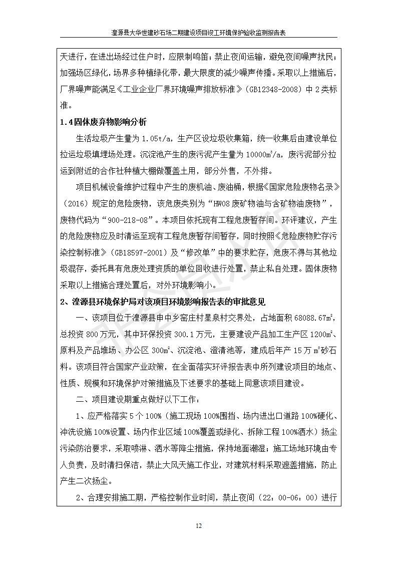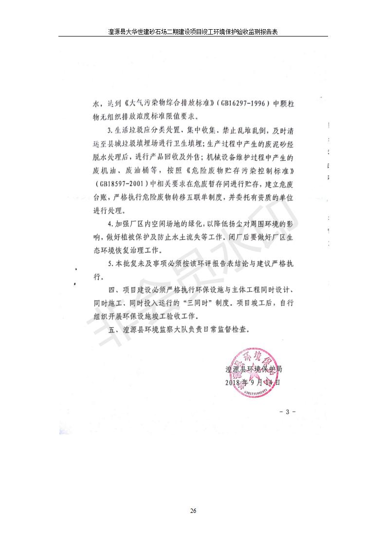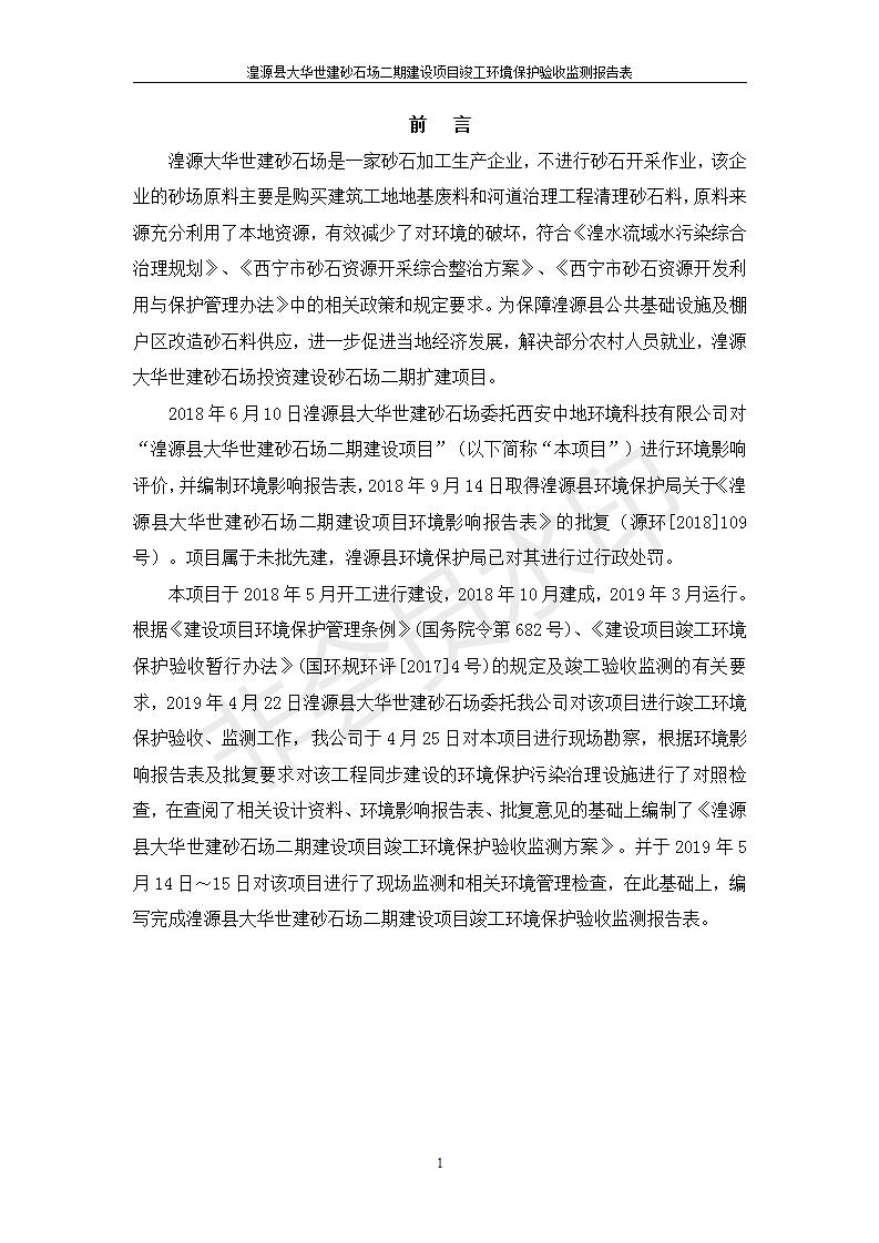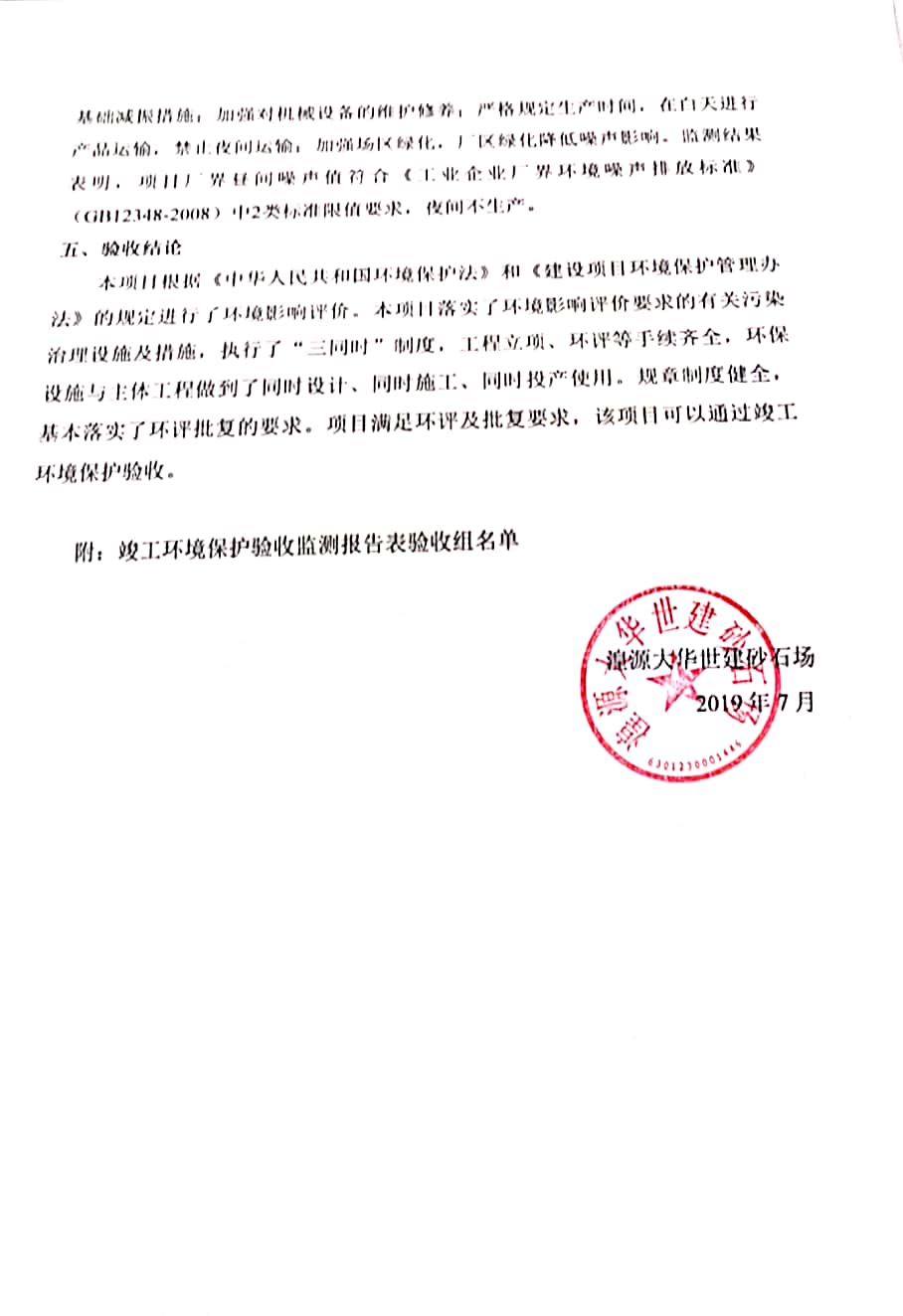 根據(jù)中華人民共和國國務(wù)院令第682號《國務(wù)院關(guān)于修改〈建設(shè)項目環(huán)境保護(hù)管理條例〉的決定》和《建設(shè)項目竣工環(huán)境保護(hù)驗收暫行辦法》(國務(wù)院令682號),湟源大華世建砂石場湟源縣大華世建砂石場二期建設(shè)項目(包括竣工環(huán)境保護(hù)驗收監(jiān)測報告表和驗收意見)公示如下。 一、項目名稱:湟源縣大華世建砂石場二期建設(shè)項目 二、地點:湟源縣申中鄉(xiāng)窯莊村沙崗大小灣 三、建設(shè)單位:湟源大華世建砂石場 四、建設(shè)內(nèi)容:項目主要建設(shè)砂石料產(chǎn)品加工生產(chǎn)區(qū)、原料堆場、產(chǎn)品堆場、辦公區(qū)等。五、聯(lián)系人:張工 六、聯(lián)系電 話:0971-6515411 七、公示時間:二〇一九年七月二十五日至二〇一九年八月二十一日公示期間,對上述公示內(nèi)容如有異議,請以書面形式反饋,個人須署真實姓名,單位須加蓋公章。