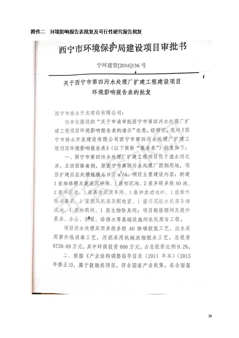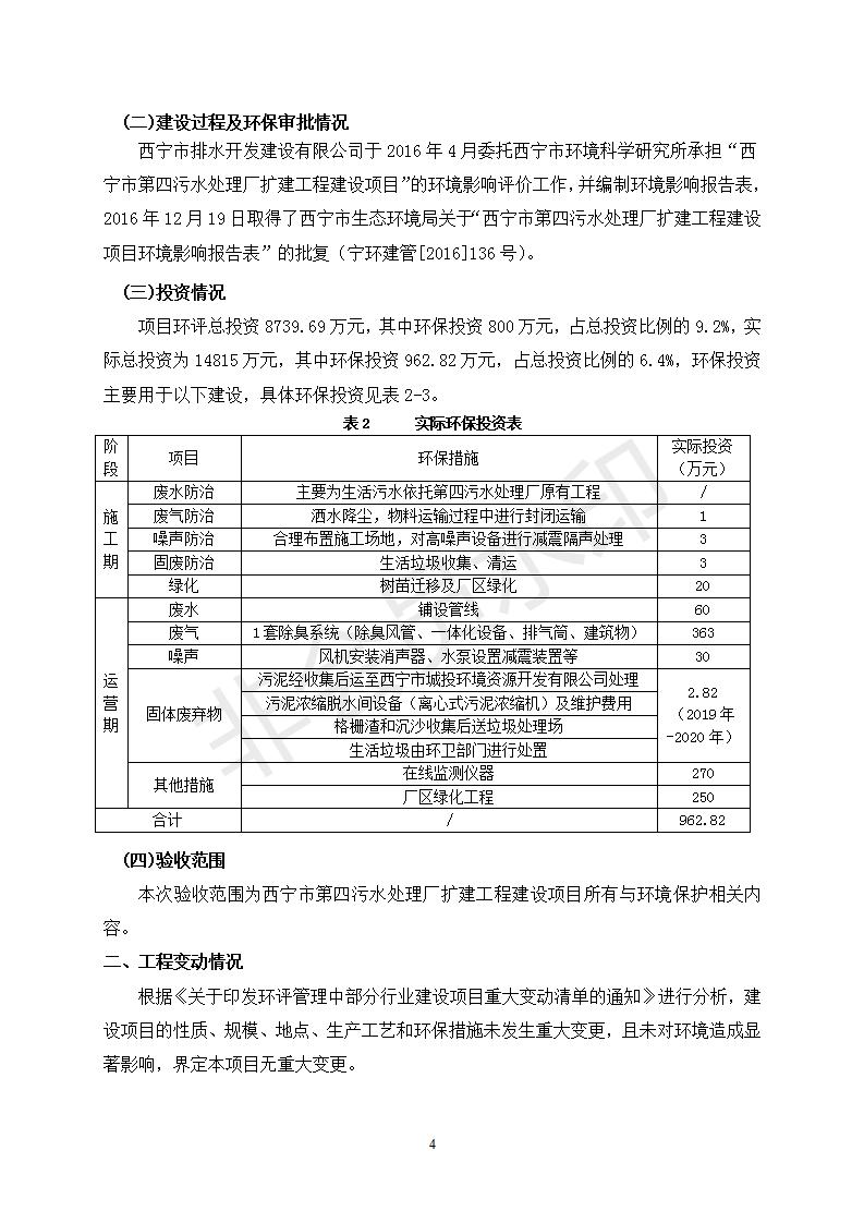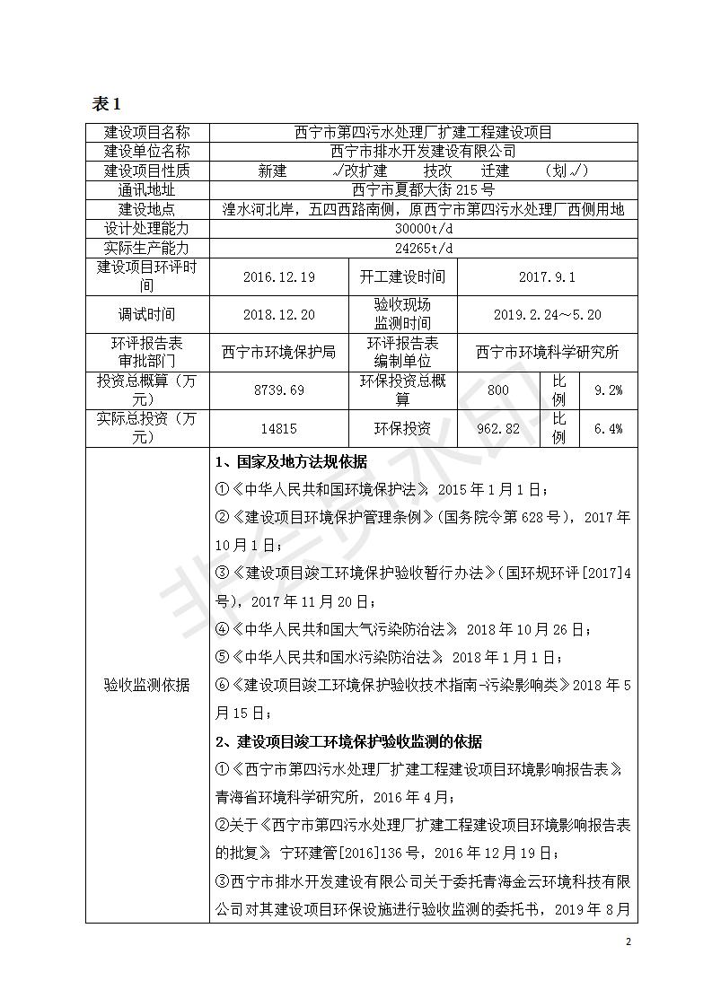 根據(jù)中華人民共和國國務(wù)院令第682號《國務(wù)院關(guān)于修改〈建設(shè)項目環(huán)境保護(hù)管理條例〉的決定》和《建設(shè)項目竣工環(huán)境保護(hù)驗收暫行辦法》(國務(wù)院令682號),西寧市第四污水處理廠擴(kuò)建工程建設(shè)項目(包括竣工環(huán)境保護(hù)驗收監(jiān)測報告表和驗收意見)公示如下。 一、項目名稱:西寧市第四污水處理廠擴(kuò)建工程建設(shè)項目 二、地點:五四西路南側(cè),原西寧市第四污水處理廠西側(cè)用地 三、建設(shè)單位:西寧市排水開發(fā)建設(shè)有限公司 四、建設(shè)內(nèi)容:第四污水處理廠擴(kuò)建工程五、聯(lián)系人:張工 六、聯(lián)系電 話:0971-6515411 七、公示時間:二〇一九年九月十七日至二〇一九年十月十八日公示期間,對上述公示內(nèi)容如有異議,請以書面形式反饋,個人須署真實姓名,單位須加蓋公章。