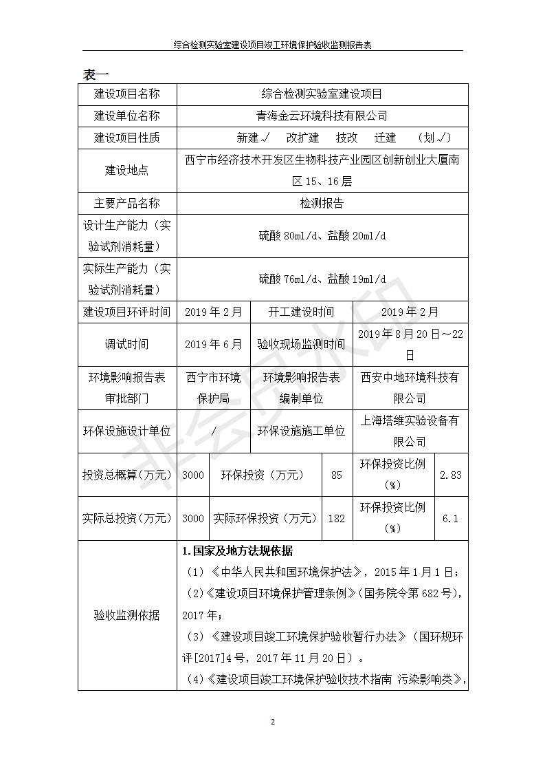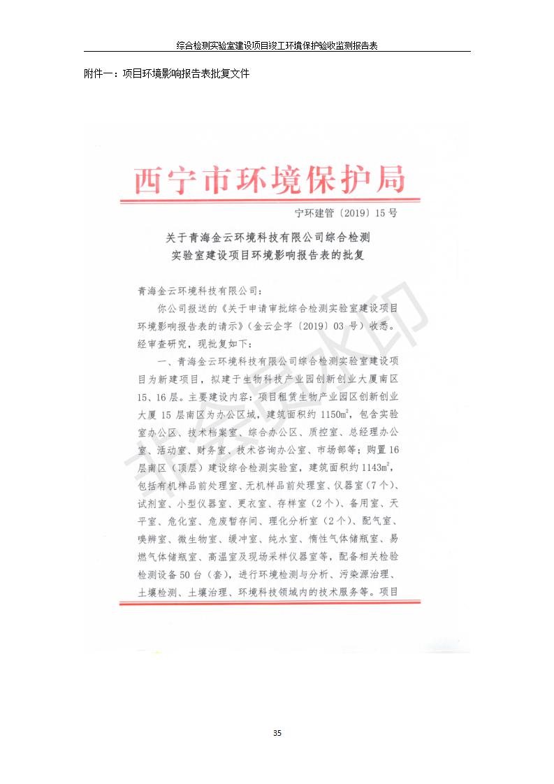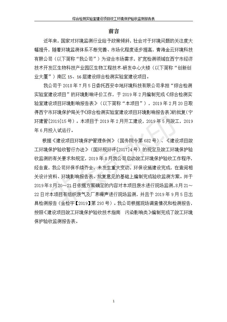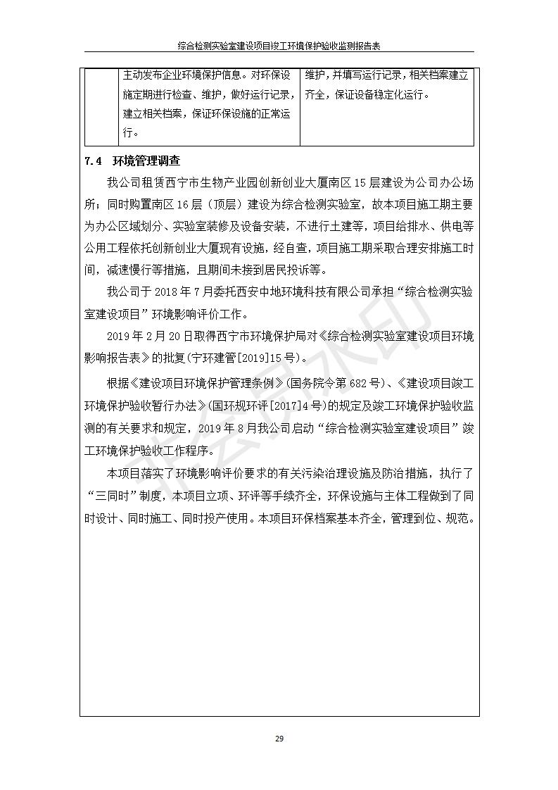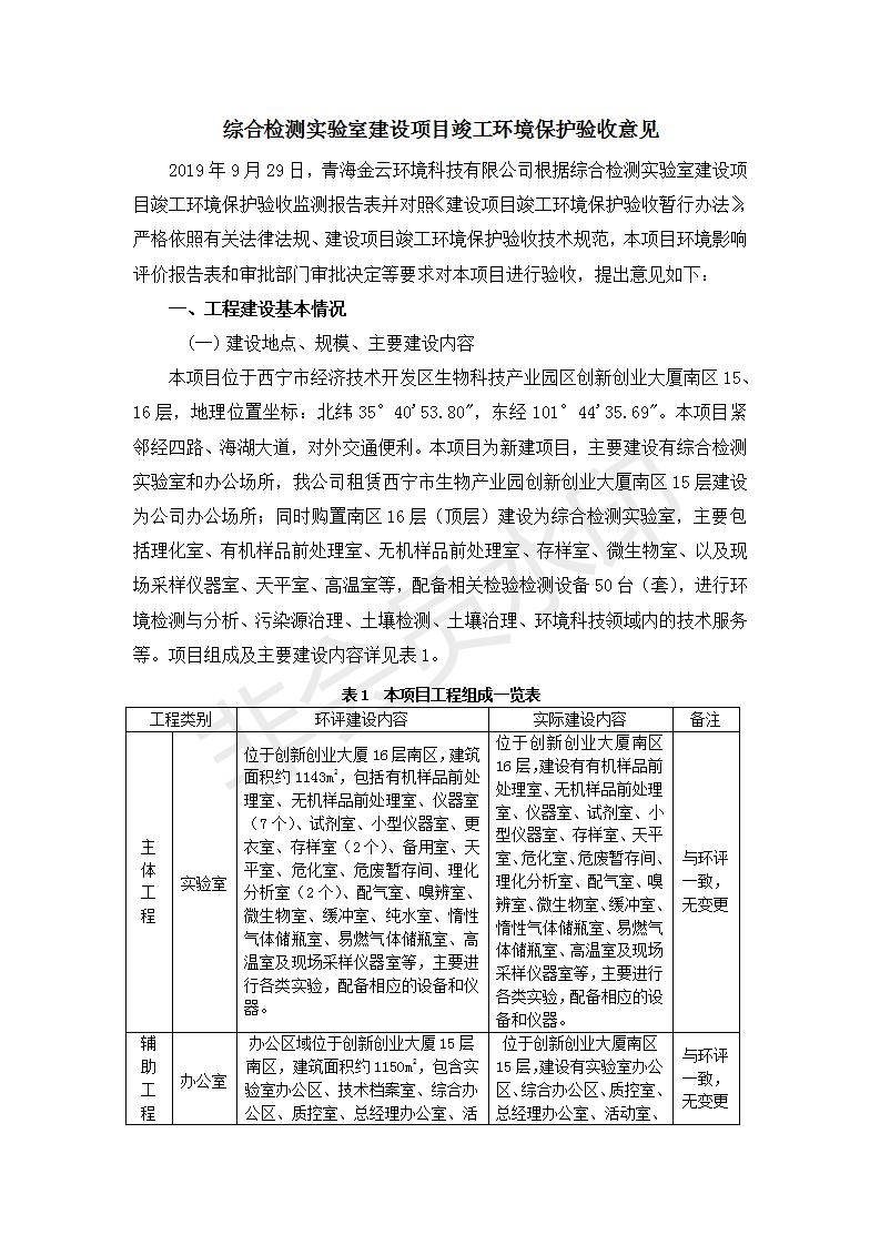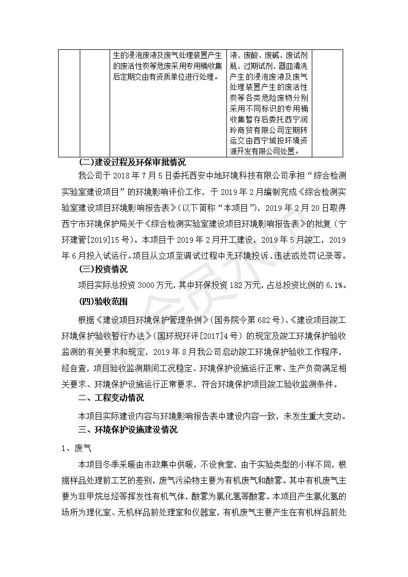 根據(jù)中華人民共和國國務(wù)院令第682號《國務(wù)院關(guān)于修改〈建設(shè)項目環(huán)境保護管理條例〉的決定》和《建設(shè)項目竣工環(huán)境保護驗收暫行辦法》(國務(wù)院令682號),綜合檢測實驗室建設(shè)項目(包括竣工環(huán)境保護驗收監(jiān)測報告表和驗收意見)公示如下。 一、項目名稱:綜合檢測實驗室建設(shè)項目 二、地點:西寧市經(jīng)濟技術(shù)開發(fā)區(qū)生物科技產(chǎn)業(yè)園區(qū)創(chuàng)新創(chuàng)業(yè)大廈南區(qū)15、16層 六、聯(lián)系電話:0971-6515411 七、公示時間:二〇一九年十一月十九日至二〇一九年十二月十六日 公示期間,對上述公示內(nèi)容如有異議,請以書面形式反饋,個人須署真實姓名,單位須加蓋公章。