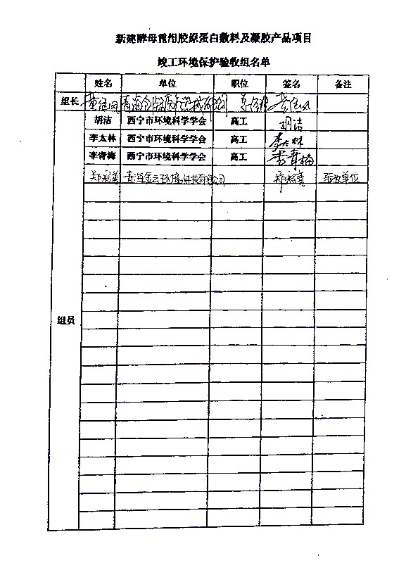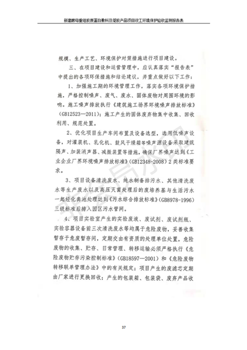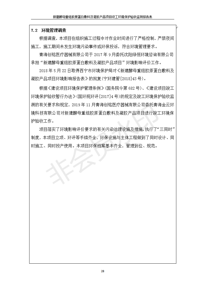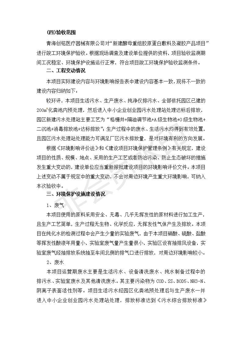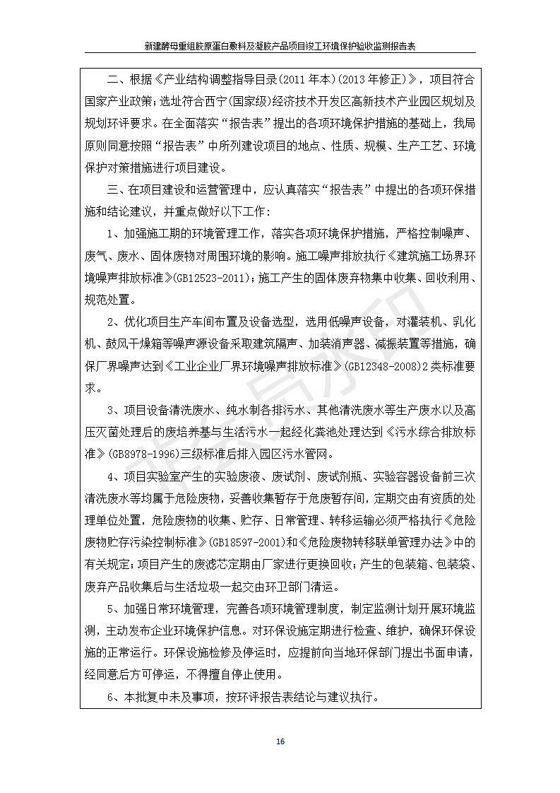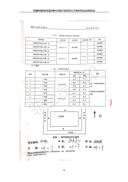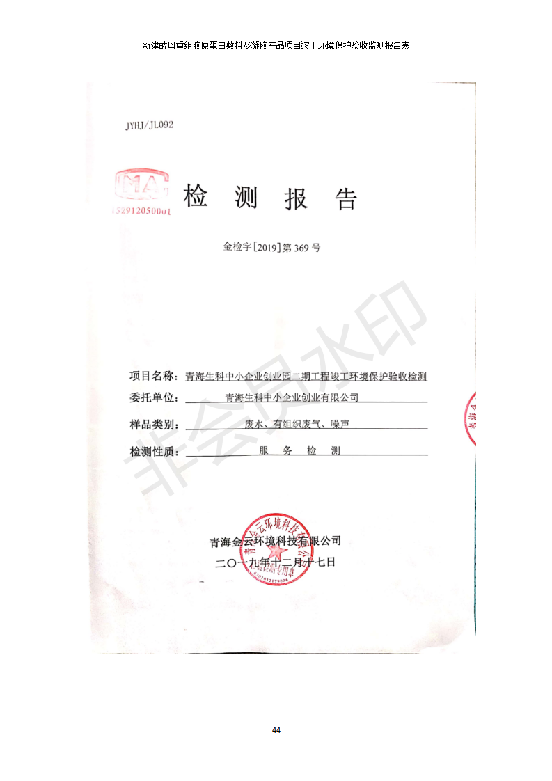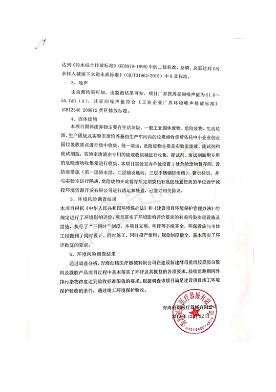 根據(jù)中華人民共和國國務(wù)院令第682號《國務(wù)院關(guān)于修改〈建設(shè)項目環(huán)境保護管理條例〉的決定》和《建設(shè)項目竣工環(huán)境保護驗收暫行辦法》(國務(wù)院令682號),新建酵母重組膠原蛋白敷料及凝膠產(chǎn)品項目(包括竣工環(huán)境保護驗收監(jiān)測報告表和驗收意見)公示如下。 一、項目名稱:新建酵母重組膠原蛋白敷料及凝膠產(chǎn)品項目 二、地點:西寧市生物園區(qū)經(jīng)四路26號15號樓2層 五、聯(lián)系人:董繼風(fēng) 六、聯(lián)系電話:18606125050 七、公示時間:二〇二〇年一月十三日至二〇二〇年二月十二日 公示期間,對上述公示內(nèi)容如有異議,請以書面形式反饋,個人須署真實姓名,單位須加蓋公章。