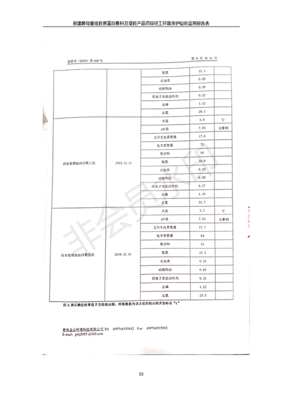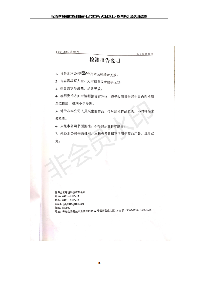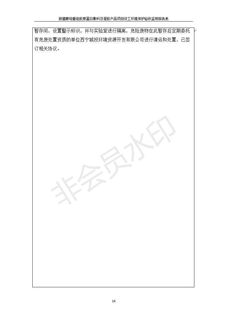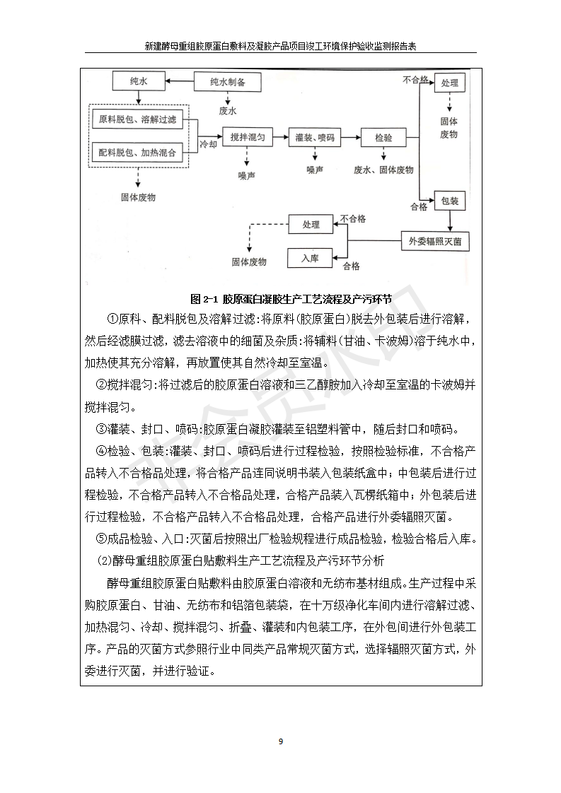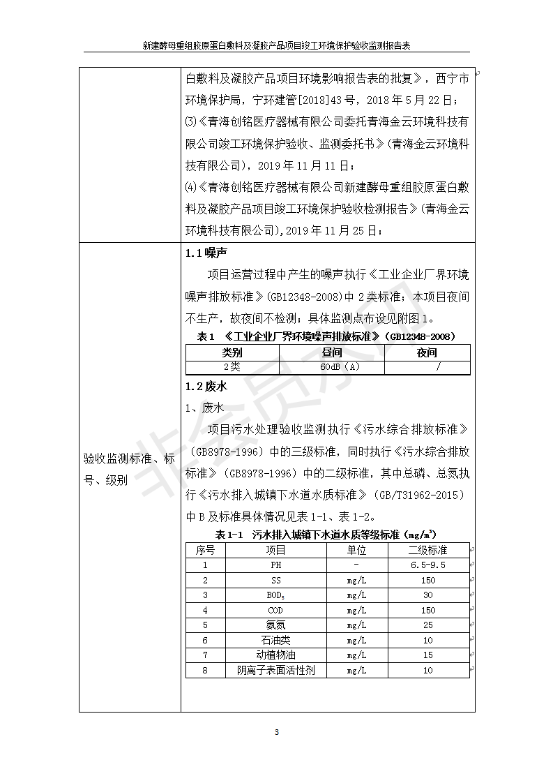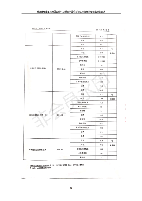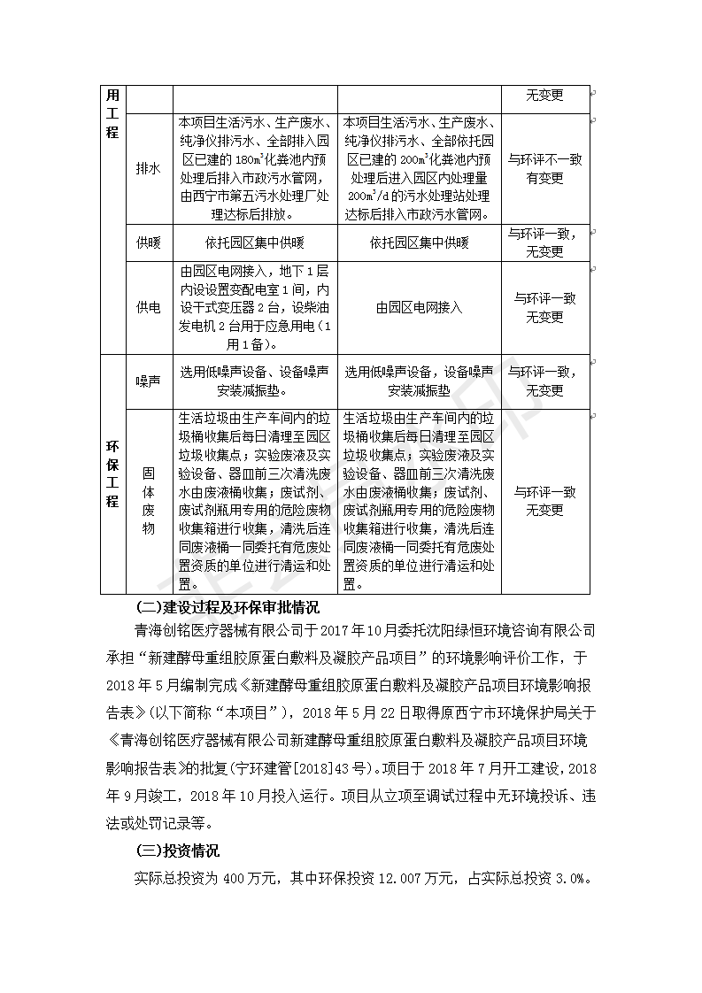 根據(jù)中華人民共和國國務(wù)院令第682號《國務(wù)院關(guān)于修改〈建設(shè)項目環(huán)境保護管理條例〉的決定》和《建設(shè)項目竣工環(huán)境保護驗收暫行辦法》(國務(wù)院令682號),新建酵母重組膠原蛋白敷料及凝膠產(chǎn)品項目(包括竣工環(huán)境保護驗收監(jiān)測報告表和驗收意見)公示如下。 一、項目名稱:新建酵母重組膠原蛋白敷料及凝膠產(chǎn)品項目 二、地點:西寧市生物園區(qū)經(jīng)四路26號15號樓2層 五、聯(lián)系人:董繼風(fēng) 六、聯(lián)系電話:18606125050 七、公示時間:二〇二〇年一月十三日至二〇二〇年二月十二日 公示期間,對上述公示內(nèi)容如有異議,請以書面形式反饋,個人須署真實姓名,單位須加蓋公章。