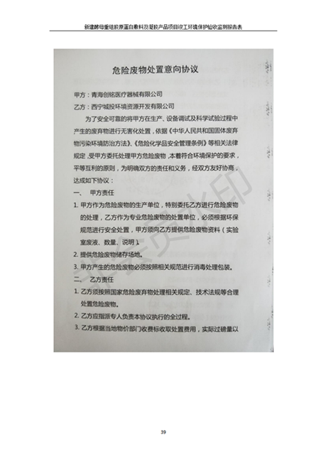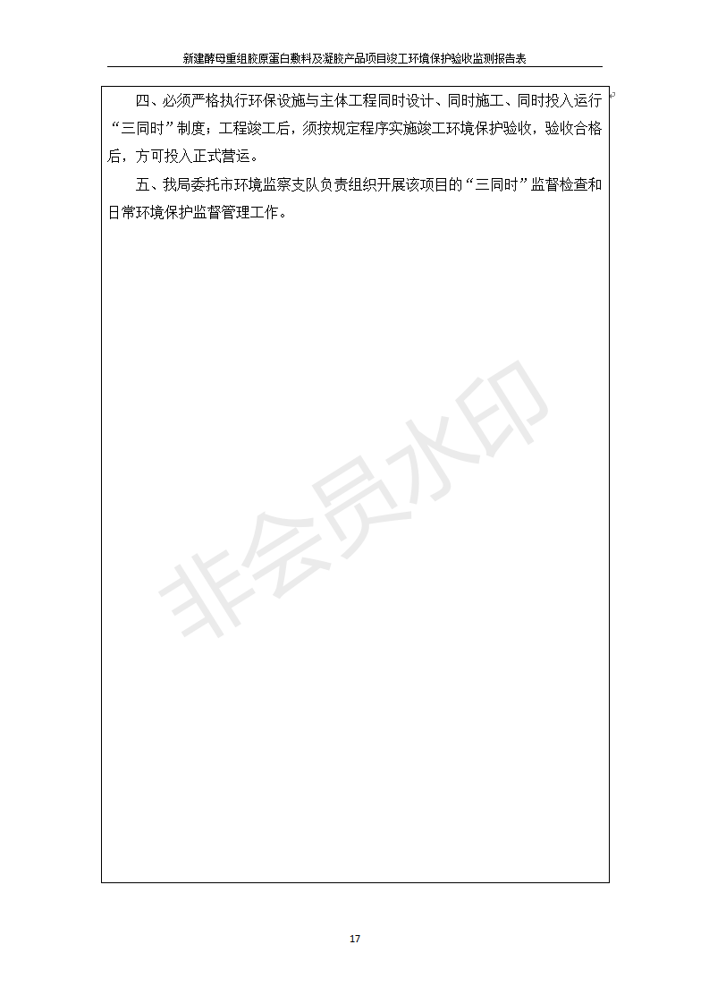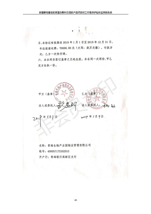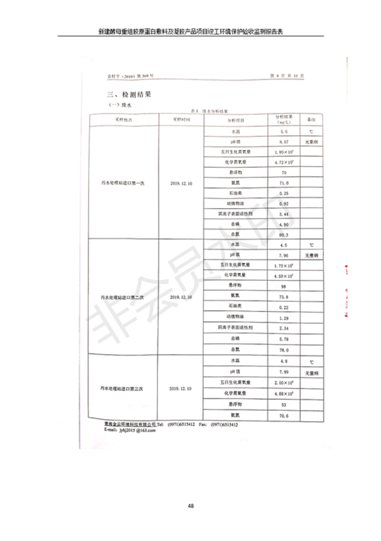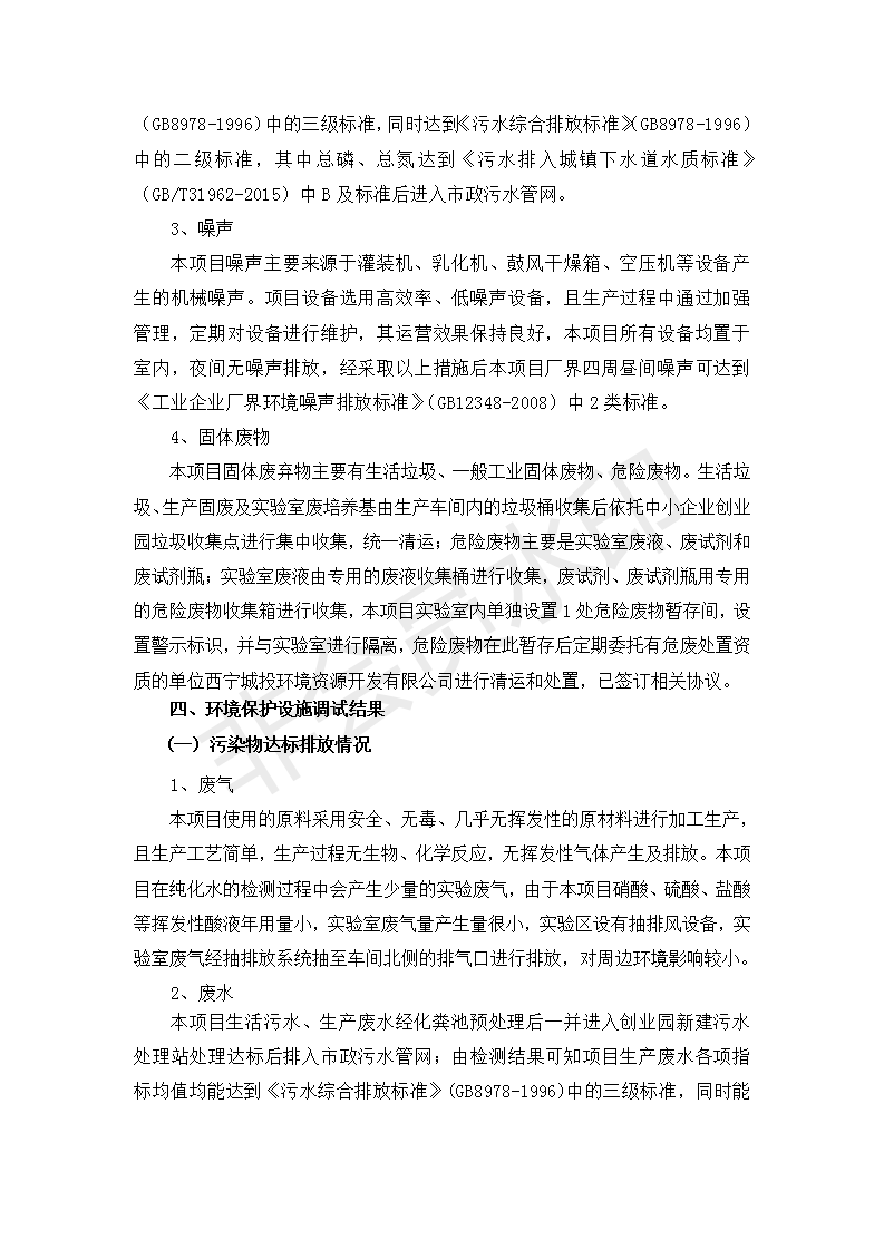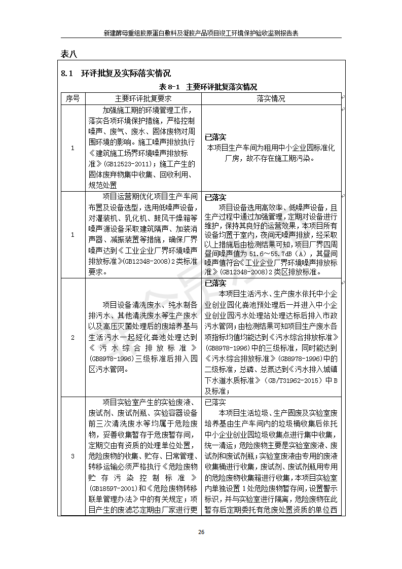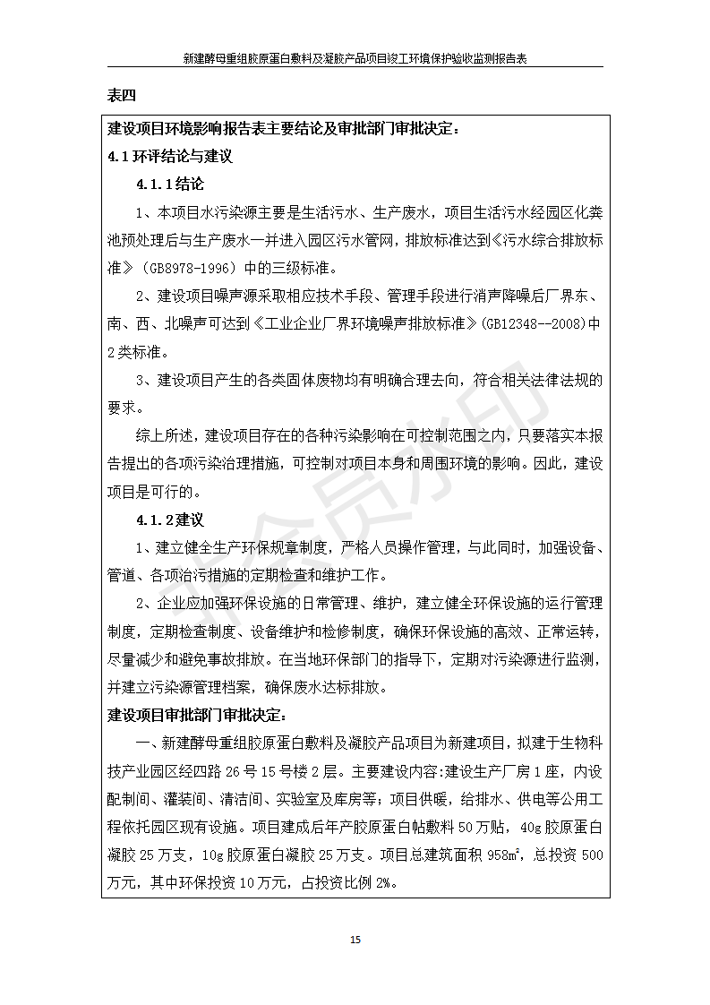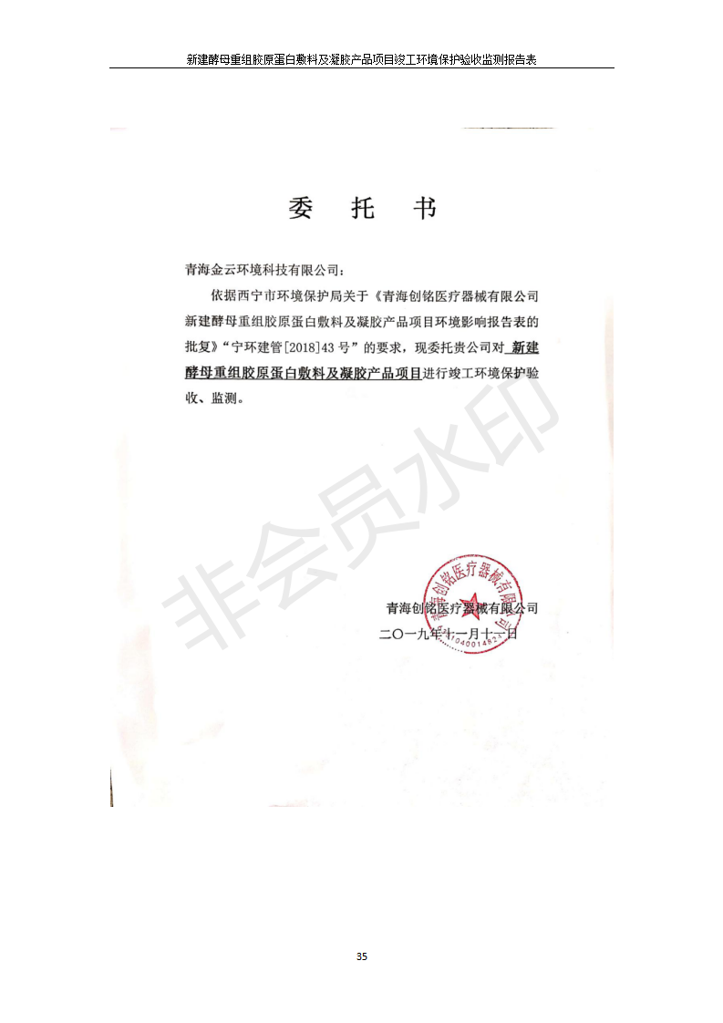 根據(jù)中華人民共和國國務(wù)院令第682號《國務(wù)院關(guān)于修改〈建設(shè)項目環(huán)境保護管理條例〉的決定》和《建設(shè)項目竣工環(huán)境保護驗收暫行辦法》(國務(wù)院令682號),新建酵母重組膠原蛋白敷料及凝膠產(chǎn)品項目(包括竣工環(huán)境保護驗收監(jiān)測報告表和驗收意見)公示如下。 一、項目名稱:新建酵母重組膠原蛋白敷料及凝膠產(chǎn)品項目 二、地點:西寧市生物園區(qū)經(jīng)四路26號15號樓2層 五、聯(lián)系人:董繼風(fēng) 六、聯(lián)系電話:18606125050 七、公示時間:二〇二〇年一月十三日至二〇二〇年二月十二日 公示期間,對上述公示內(nèi)容如有異議,請以書面形式反饋,個人須署真實姓名,單位須加蓋公章。